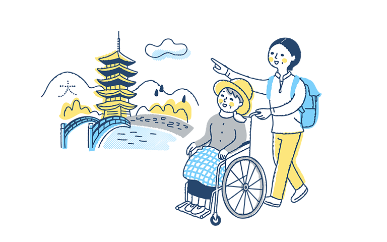 特別な訓練をうけた介護旅行の専門家“トラベルヘルパー(外出支援専門員)®︎”が、ふるさとへのお墓参り、お孫さんの結婚式、グルメのまち歩き、コンサートや美術館めぐりなど日帰りの身近な外出から、宿泊を伴う国内旅行まで、さまざまなお出かけをサポートします。